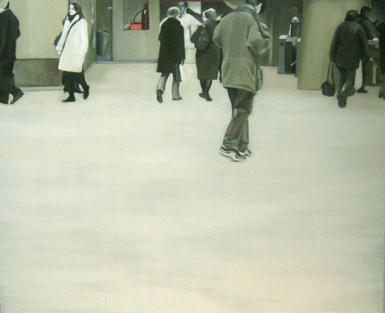 This painting describes one moment in the Milan subway . The name of the station is "Cadorna"