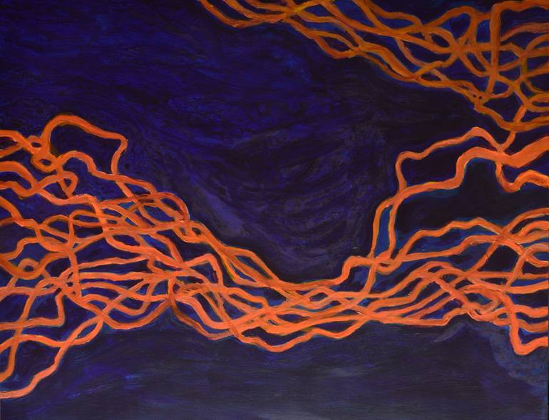 Image imaginaire et symbolique des rapports qui nous lient aux êtres que nous aimons. Couleurs dorées et cuivrées qui refléchissent la lumière. Peint sur toile de lin. L'oeuvre sera expédiée dans une caisse.
