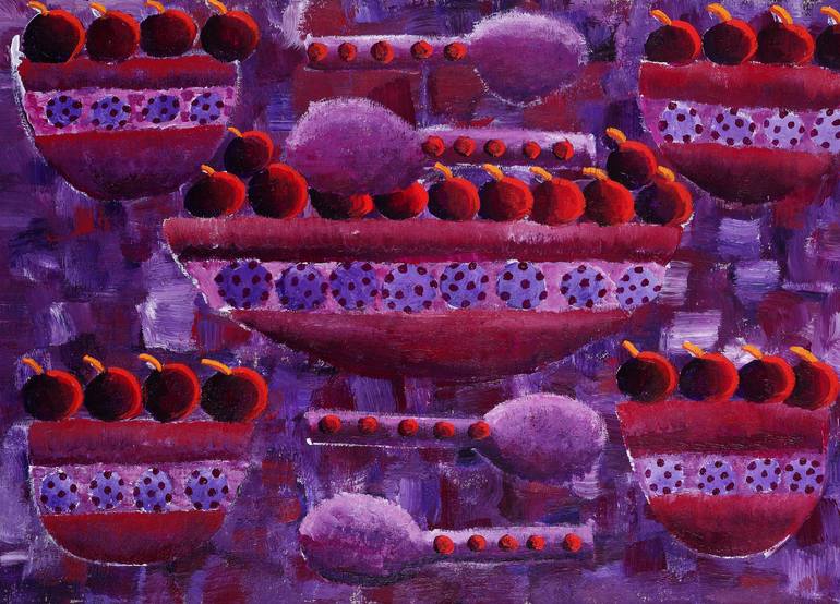 I felt inspired to paint this decorative painting of 'Red Cherries in Bowls' after our third child was born. At the time I was determined to get back to my pre-pregnancy weight and I was eating a wide variety of tasty fruits. I couldn't resist painting the rich colour of the cherries. I love workin...