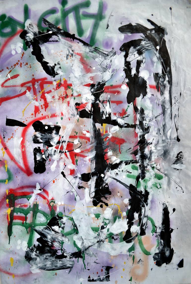 CITY is a fusion of street art graffiti with black and white abstract expression painting layering which elevates graffiti into the museums and art gallery's of the world. Some the black strokes take on a Japanese calligraphy especially since the black and white may depict the philosophy of the Yin ...