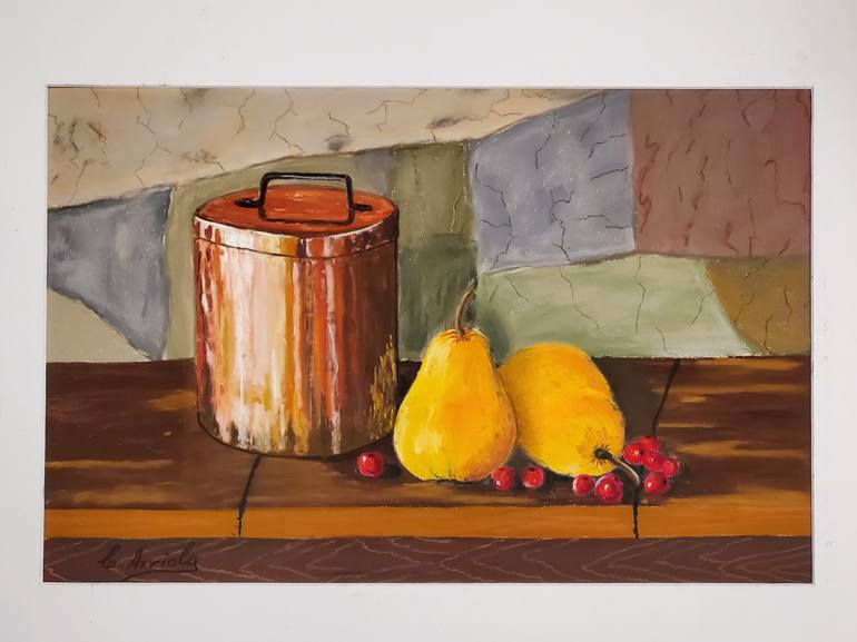 THIS SOFT PASTEL PAINTING WAS DONE ON UART 400 SANDED PAPER MOUNTED ON RIGID FOAM BOARD. THE COPER POT WITH ITS REFLECTIONS DROVE ME TO PAINT IT. THE BEATY OF SUCH METAL IS AMAZING..