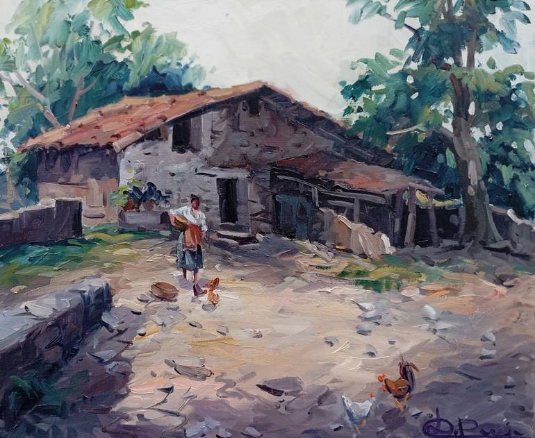 Pintura al oleo sobre lienzo,pintada al aire libre,con gran contraste entre los colores rojizos del tejado,con los verdes de los arboles y los violetas en sombra de la cabaña,con los amarillos del cielo y del suelo en primer plano,creando un fuerte impacto visual de colores complementarios.