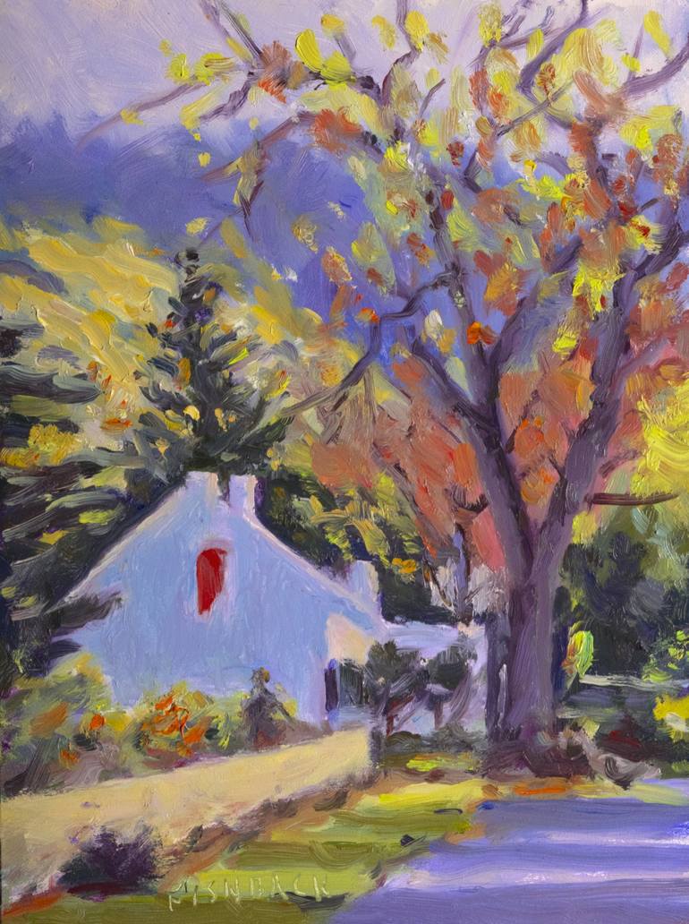 Vibrant brushstrokes bring to life a scene of a cozy blue house nestled among autumnal trees. A fiery palette of yellows, oranges, and reds captures the seasonal change, contrasting against the cool blue sky.