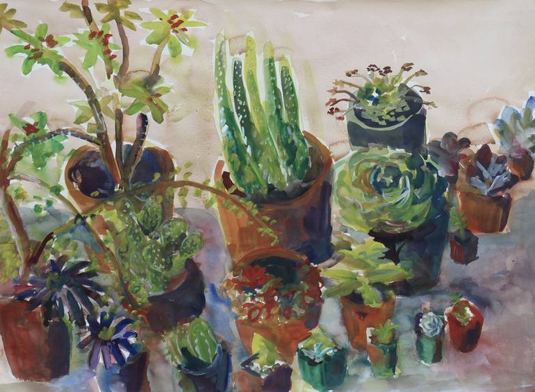 Large Plein air watercolor of the cactus plants in the backyard.