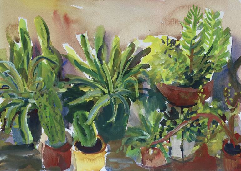 Plein air watercolor of the cactus plants in the backyard. I did two watercolors at the same time. The other one is listed too. It's titled "Cactus plants number one".