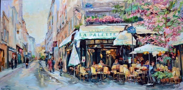 In this painting, representing the scene of Parisian life, I want to catch the ambiances, create a movement with the gesture of my brushes and palette knives. There is some impressionistic inspirations here, but I work in my personal style, creating a rich textures representing a spring blossoming t...