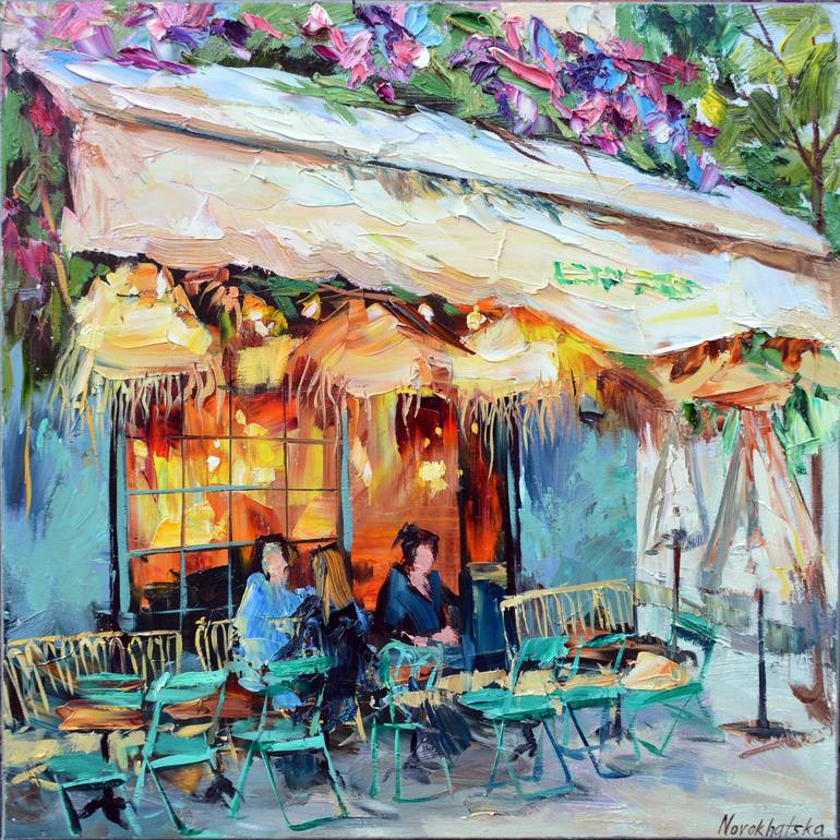 In this painting, representing the scene of Parisian life, I want to catch the ambiances, create a movement with the gesture of my brushes and palette knives. There is some impressionistic inspirations here, but I work in my personal style, creating a rich textures.