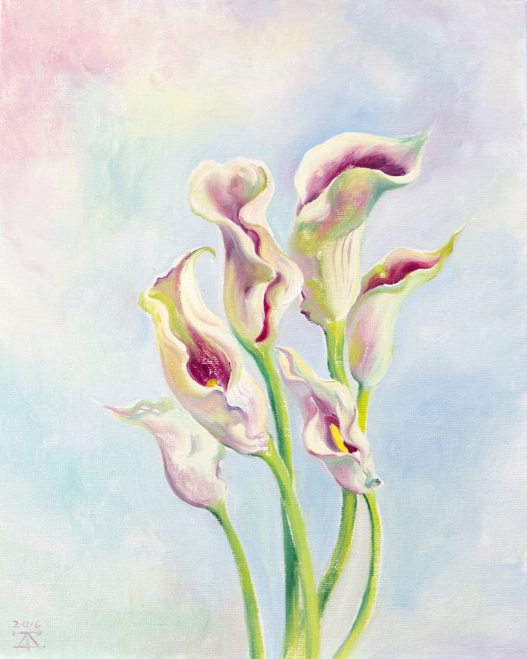 These rare exotic flowers won my heart with majesty and elegance. It was my first experience to paint Calla Lily flowers, and I like it pretty much. I chose a light pearl background and compose a simple flower group in an ascetic bouquet. Carmine saturated cores of the flowers look really incredible...