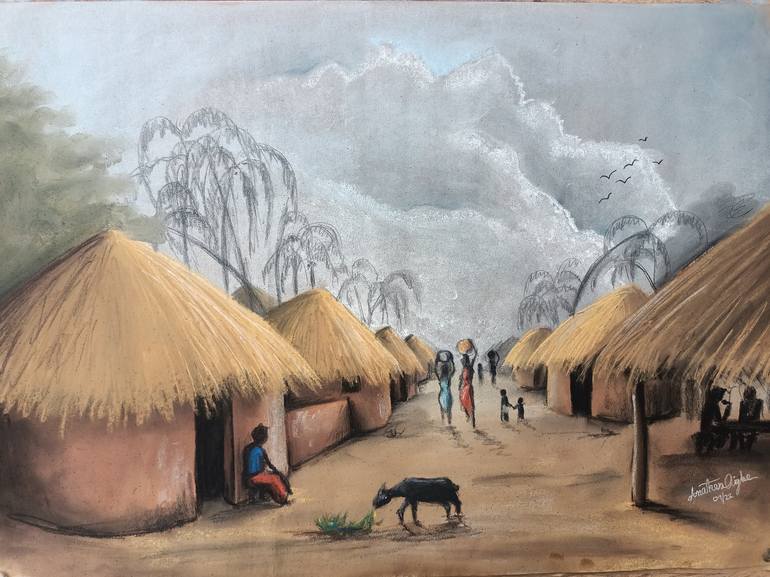 Painting was created with chalk pastels and was inspired by how fascinating life must have been in Nigerian villages before electricity and machines, how calm and peaceful village life was. The communal feeling, relative safety and the beauty of nature all around.