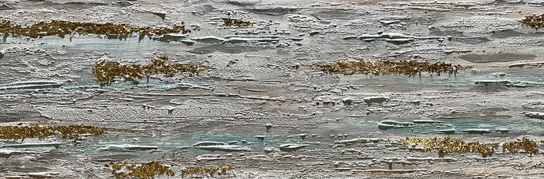 Calm" is an exquisite mixed media abstract artwork that is a masterful blend of texture, color, and luxury. The artist has expertly used texture paste, gold leaf, and acrylic paints to create a captivating piece that exudes tranquility and elegance. The dominant colors of gray and cyan green form a...