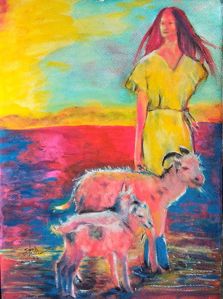 It's a painting of a girl with three lambs in early morning. Impression painting in watercolor on paper.