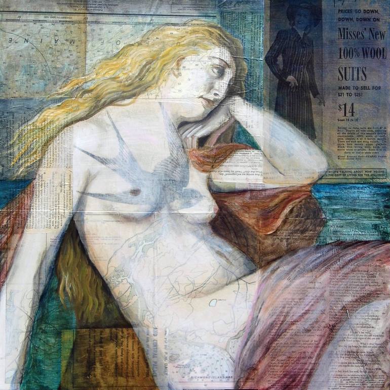 An interpretation of Calypso by Henri Lehman 1869, from my Deconstructing Venus series. Acrylic and collage with vintage maps, newspapers and paper ephemera on birch plywood. Edges painted black, wired and ready to hang.