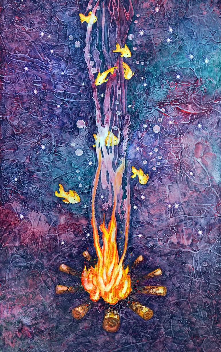 I painted this experimental watercolor in June. Because June is time of campfires, time to think in the sea and have summer dreams. The little fishes are our magical simple moments that we have each days. Those that make the life special. The experimental watercolor allows something quite difficul...