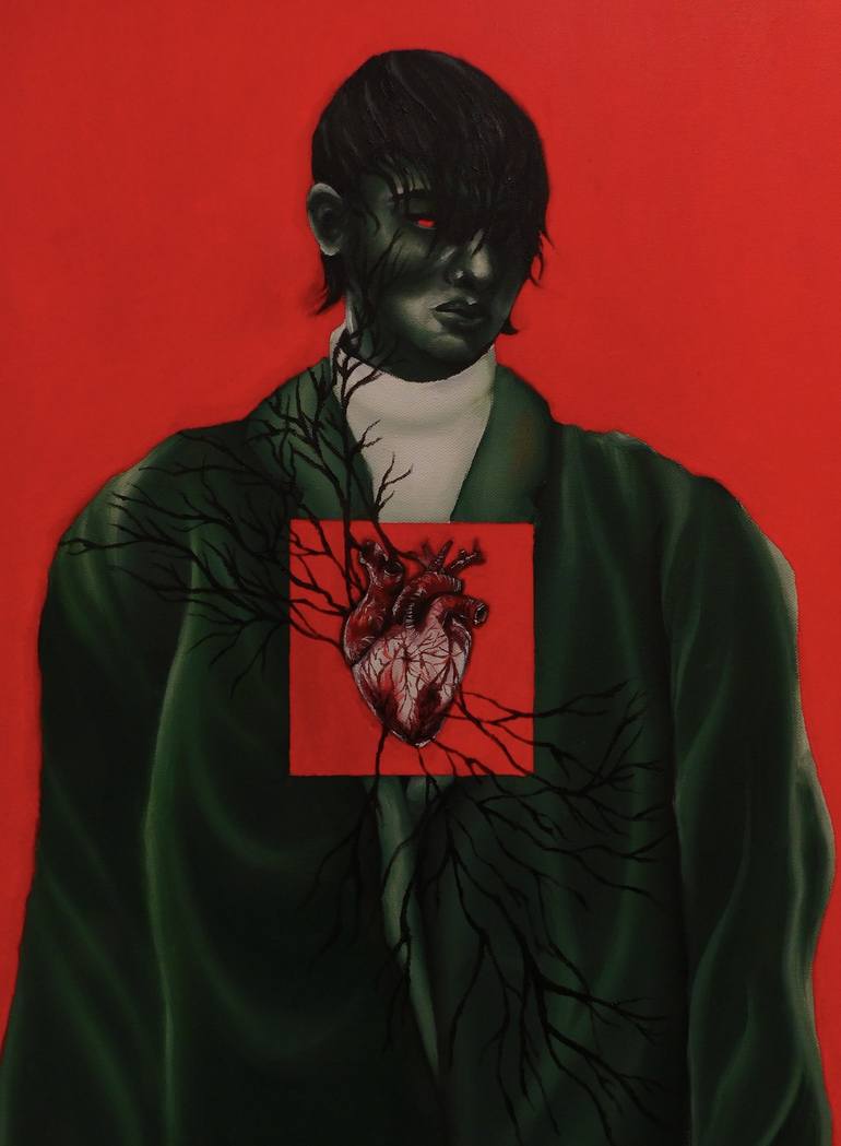 Often in my artwork I use anatomical hearts to represent the soul. In this painting, I was studying the emotions of anger, grief, and loss as I painted this not long after my uncle's passing. To me this painting represents how the body is void, a mirage, a layer of what we believe is reality due to ...