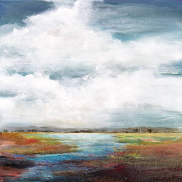 This artwork captures the beauty of clouds over a serene stream, brought to life with vivid textures and layers. Inspired by a calm contemplative afternoon, every detail reflects that moment. This impressionist painting is presented on a gallery wrapped canvas and has 15+ layers of acrylic paint an...
