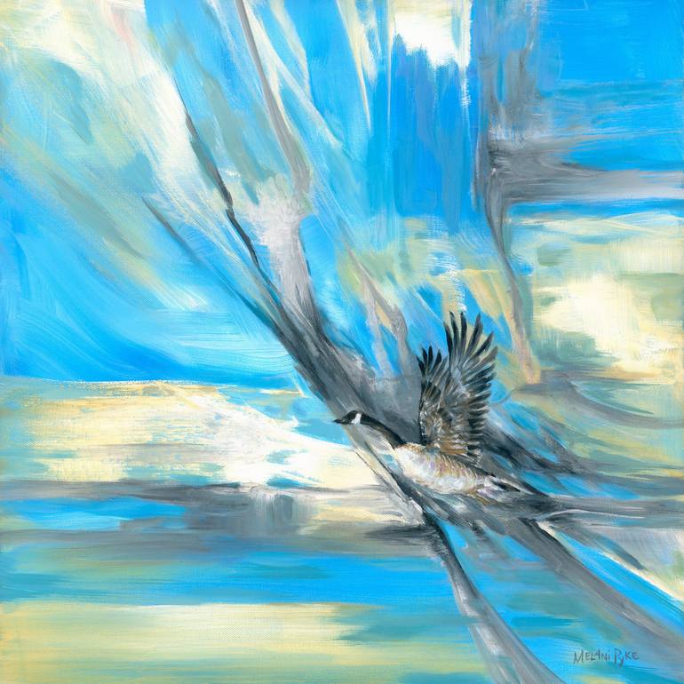 Acrylic and oil on stretched canvas 1.5" ready to hang, varnished. Flow of water, migration and flight are themes explored in this painting that combines abstract and realism.