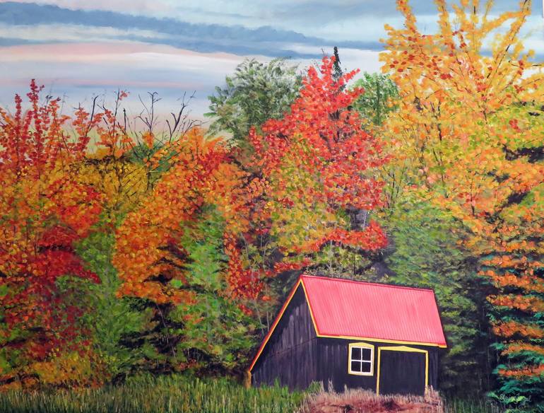 Having lived in the vibrant landscapes of Canada, I find inspiration in the breathtaking colors of autumn. This original painting of a Quebec scene invites you to step into a tranquil landscape, where vibrant colors dance among the fiery red, orange, and yellow leaves, and a cozy cabin stands as a w...