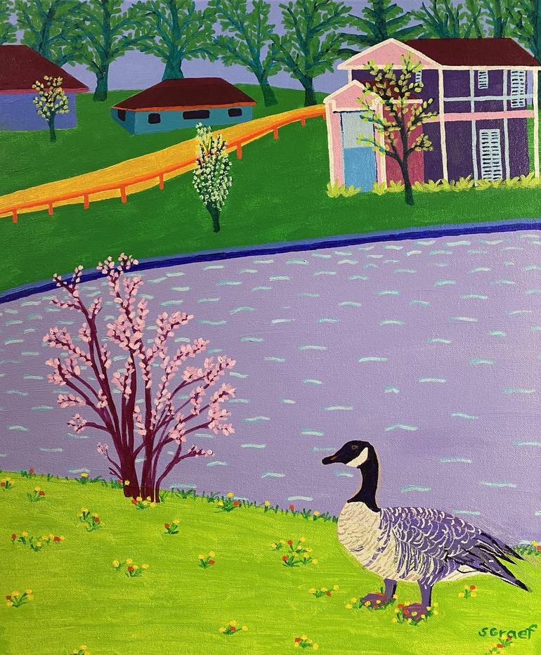 Here is my vision of a beautiful scene in the rolling hills out in the countryside in the springtime with flowers blooming and a Canadian goose visiting the pond. It has an interesting pallet of purples, pinks and greens, attractively creating an inviting sense of depth. The artwork is acrylic paint...