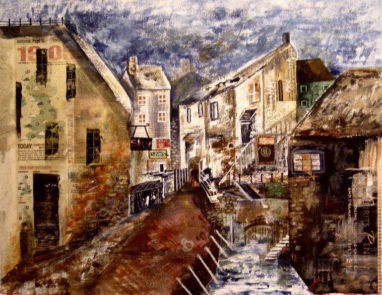 Aims to capture the feel of a canal town using mixed media. Atmospheric.