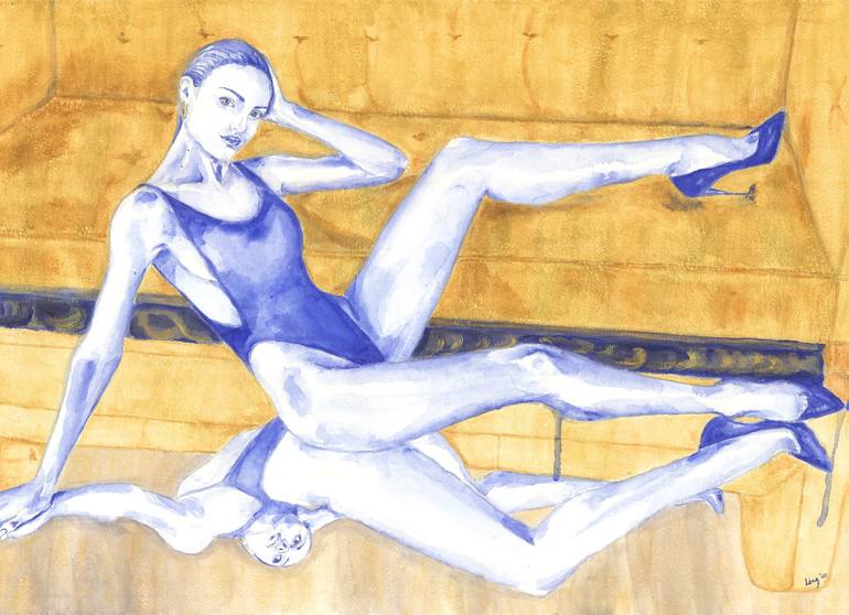 The title shows clearly who inspired me for this monochrome watercolour. I used blue to enhance the perfection of her figure and the acrylic gold I used to portray her royal beauty.
