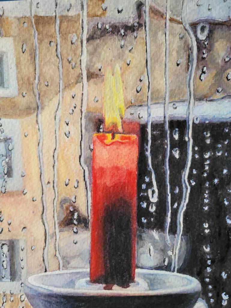 Original watercolor painting candle with rain . A romantic view of a candle lit through a window in a rainy weather