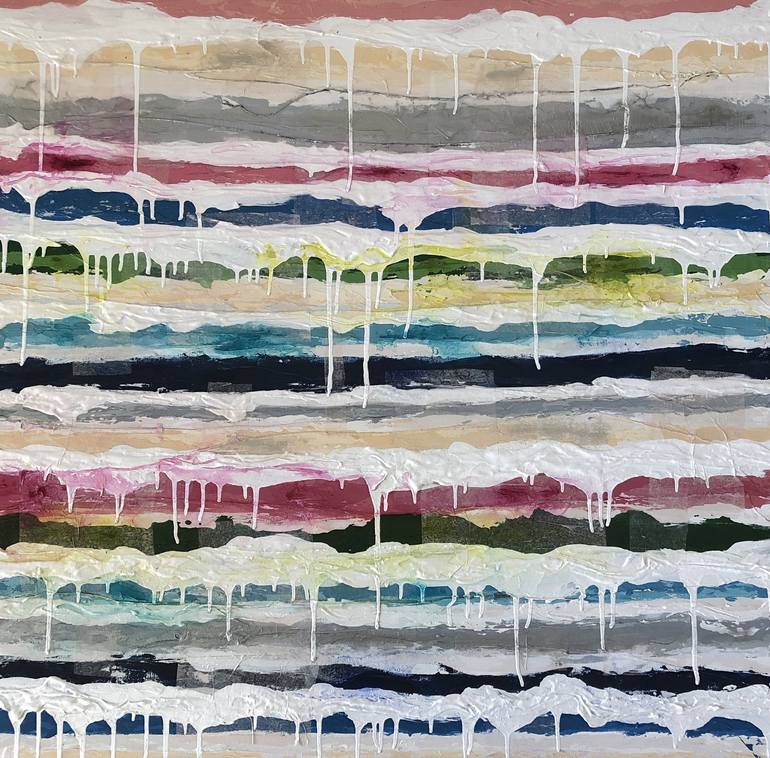 Ready to hang, Gorgeous layered colors built up with tulle and cotton string. Over an inch or depth in paint with drips and textured. Bright and cheerful yet neutral enough to go with any interior.