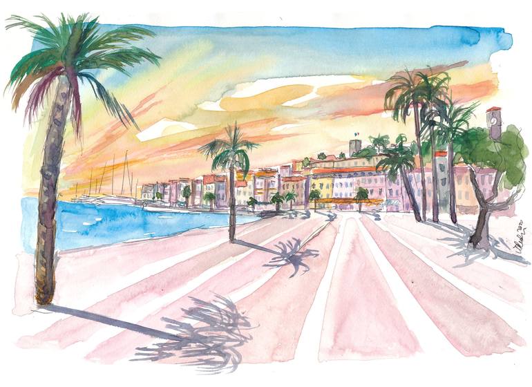 Cannes French Riviera Waterfront Promenade - Watercolor on Paper Painting