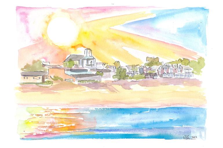 Cape Cod Coastal Beach House Scene at Sunset - Watercolor on Paper