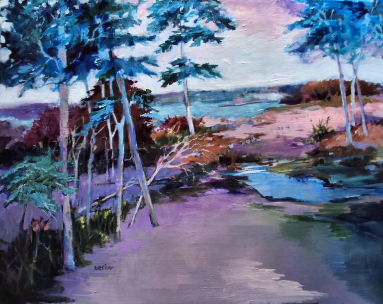 .A scene remembered. It was after a light rain, and cloud reflections were pink, and it was beautiful, and I may have exaggerated them a bit......"artist's license." The painting is 16 x 20 inches. Framed it is 17 x 21 inches.