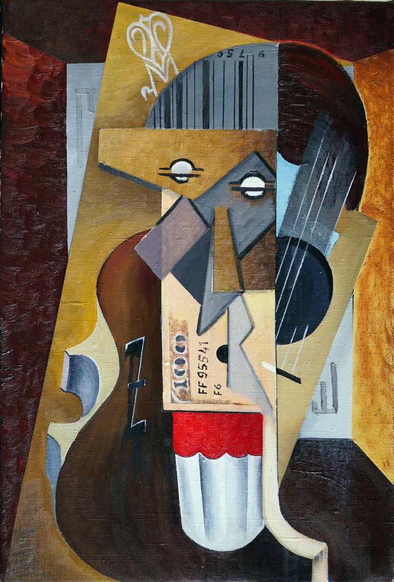 obra cubista intentando relaciona el dolar y el desorden que hay en el mundo. pintado por relacionar el billet verde (100 Dólares) y las artes