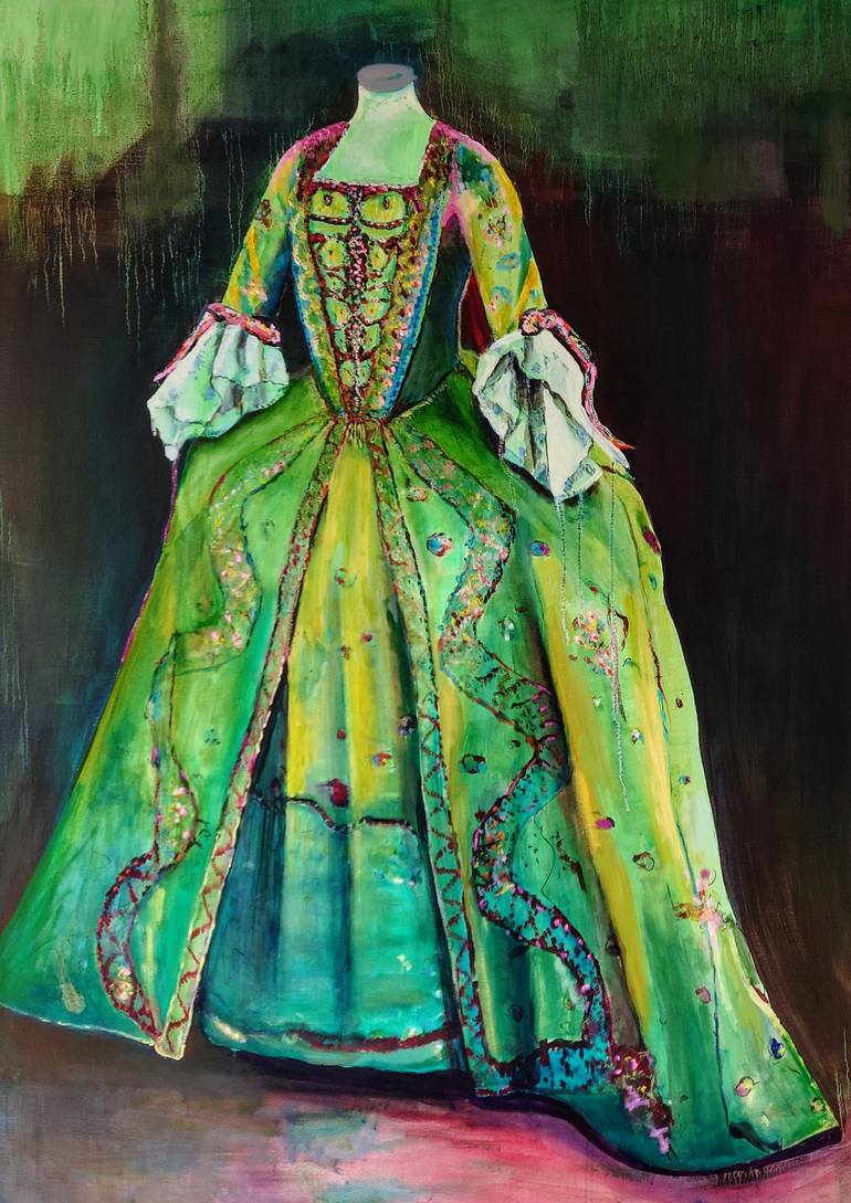 A rococo dress 1750s, a court dress included elaborate and intricate styles influenced by Rococo. Hoop skirts, panniers, corsets, petticoats, conical torso shape with large hips. It is very interesting to paint such a dress, to represent the embroidery,I used goose feathers to get that effect. And t...