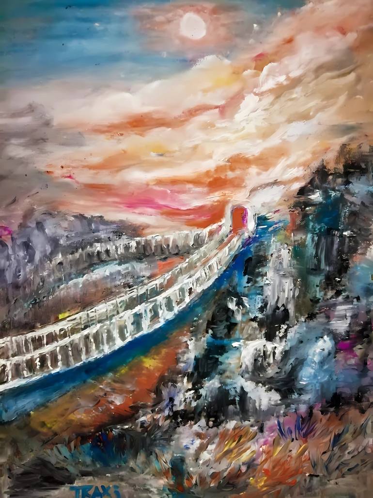 "Road to Heaven" is a captivating original abstract oil painting that invites viewers on a journey into a mystical landscape. This piece features a surreal scene with an orange sky, tranquil blue rocks, and a rope bridge leading towards the heavens. Painted with oil on canvas, the artwork is enriche...