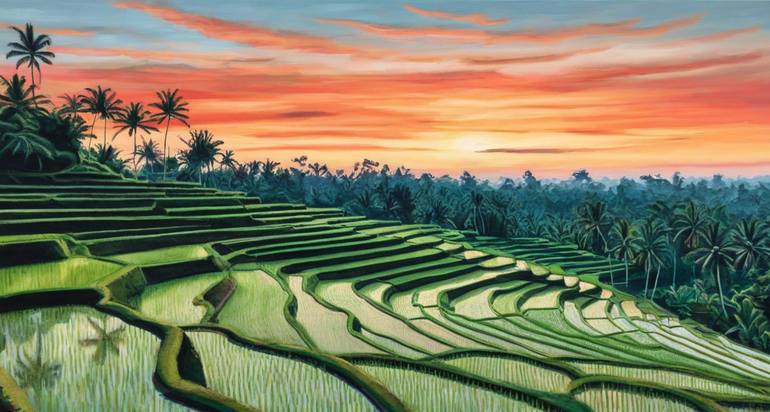 Captivating Terraced Rice Fields of Ubud, Bali This stunning painting of terraced rice fields will immerse you in the serene beauty of Ubud, Bali. The lush green of the rice fields cascade elegantly across the landscape. The vibrant greens are beautifully contrasted with the rich, warm tones of a...