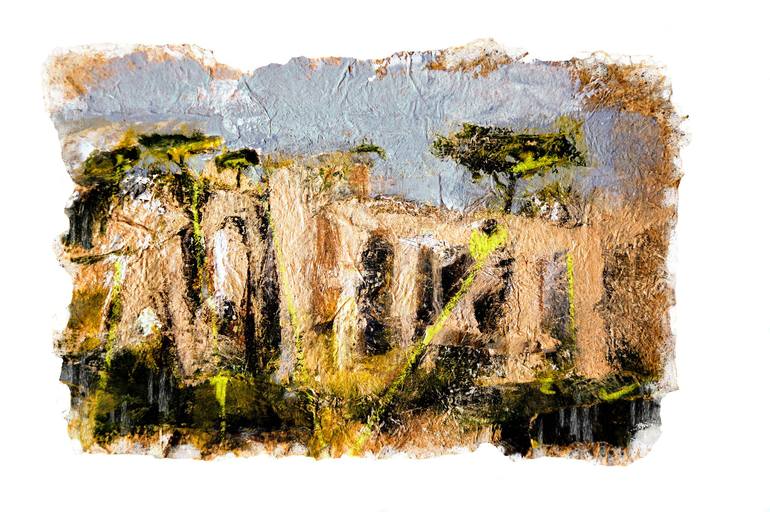 Interpretation from Caracalla thermal baths from the Circus Maximum, Rome Original on handmade paper from Villa Ada grass, painted with acrylics, collage and pastels.