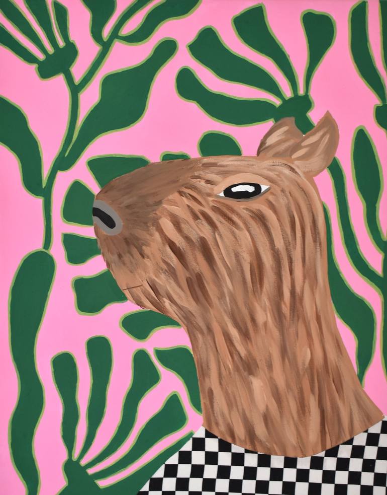 Through painting and sculpture, Los Angeles-based world builder Emily Veldman captures the narratives of her expansive fictional land. In her work, she creates imaginary safe spaces as a method of healing and coping with mental health. Her world is an escape from the harsh realities of adulthood. In the blank space on the canvas, she blocks out the responsibilities and anxieties of adulthood and replaces them with a colorful fantasy landscape. The stage is set with patterns, bright colors, and composition. By combining these elements the audience is transported to an altered Los Angeles where personified flowers and animals live and play.
