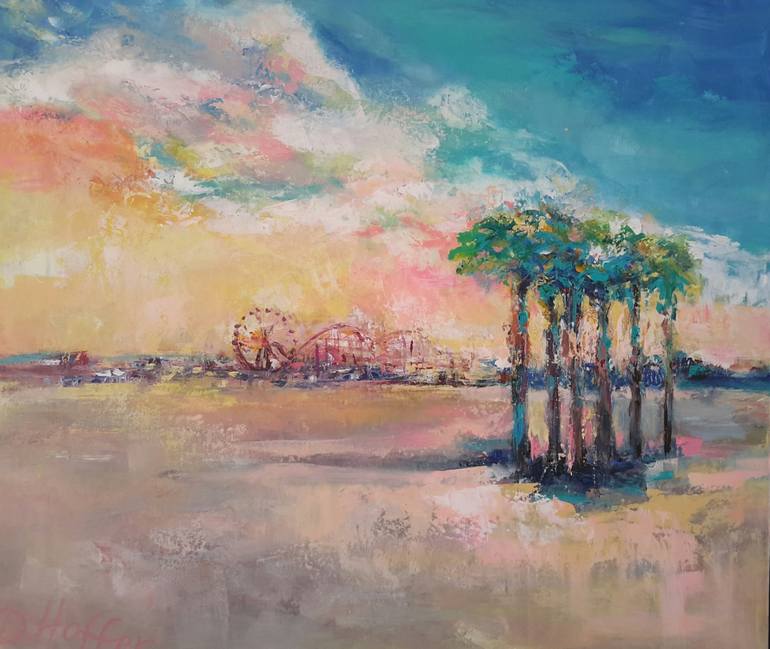I was inspired by Santa Monica. CA. The light in the clouds over the beach in the morning. I wanted to evoke a feeling of happiness and hope. Many colors and layers make up the sand. The original canvas is 1 1/2" inches thick gallery wrapped. This piece is framed in a black wood floating frame 2" in...