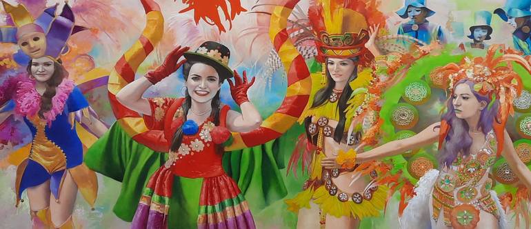 "Carnival" bursts with vibrant energy and celebration, capturing the joyful chaos of a cultural festivity through four central female figures adorned in colorful and extravagant costumes. Each woman represents a different cultural or stylistic expression of carnival, dancing across a background awas...