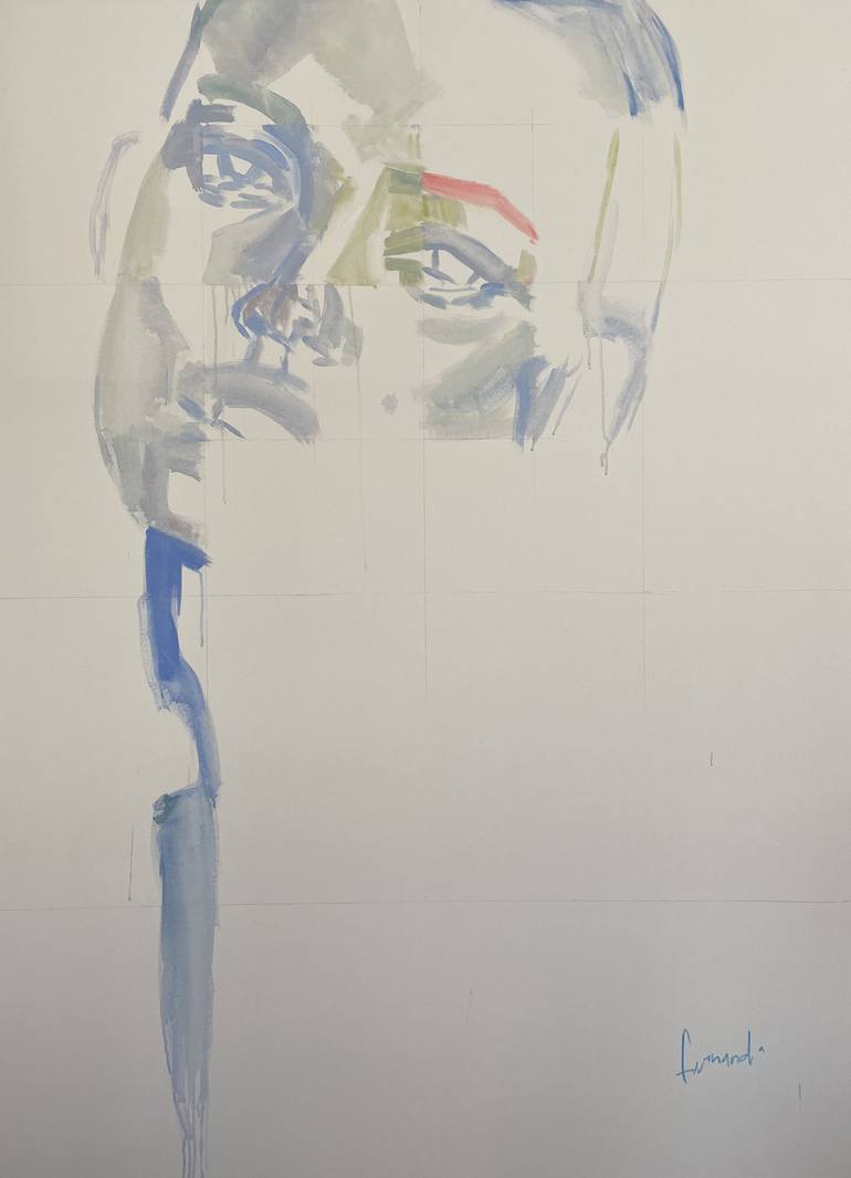 Portrait painting in acrylic, used as if it were watercolor, I am focusing on the process of creation and letting loose. Mixed feelings of letting the artwork speak and let me know when to stop/ when is a painting complete? With the blue color palette the emotion is automatic transmitted to the mode...
