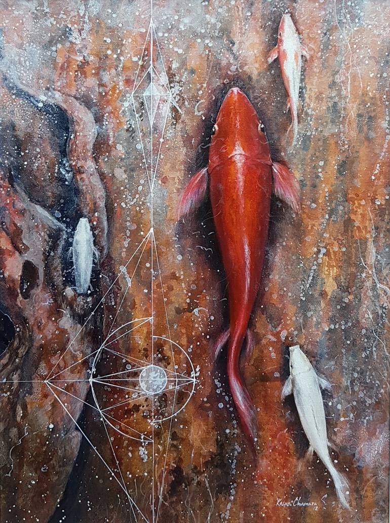 Surreal geometry and vibrant patterns are the subject of Kasun Wickramasinghe’s paintings. The artist sees himself as a merger of “abstract trends with natural concepts” and represents the world through a large kaleidoscope. Through Kasun’s paintings he has developed a close kinship with the natural world, and visualizes it mythically, beautifully and expressively. The inner world of dreams and cultural memory is made to contend with utopic patterns and textures. These graphically striking images allow the physicality of nature to reveal itself. Working with acrylics, oils and mixed media, Kasun employs a bold color palette and fluid style to capture the essence of his world. He confesses his great obsession with vibrant colors and the playing of light and shadow. “My paintings are characterized with contemporary and conceptual ideas highlighting natural trends” says Kasun. These conceptual ideas are enhanced by his skill at rendering lifelike figures with his sharp eye for manipulating proportion and scale and abstracting it. His work transforms standard notions of realism into a uniquely expressive form, while his utopic imagination rejuvenates the eye of the viewer with fresh color. Kasun’s paintings are perfectly proportioned and laid out across the canvas as he has included his knowledge of his first-class bachelor’s degree in painting, and the learning experiences as a freelance artist and lecturer at the University of Visual and Performing Arts. His meticulous geometrical measurements add symmetry to his paintings to add a sense of reality to such divine phenomena. They connote nature’s spiritual power and timelessness. The spontaneous gestural brush-strokes and mark-making leave an impression of the abstract expressionist within Kasun. As much as his work is truly abstract, it is also expressive and emotional. His inner impulses are splashed across the canvas in a spontaneous and improvisatory manner, while it is deeply rooted in spirituality and mythology. Simple compositions with large areas of color intend to produce a contemplative and a meditational response in the viewer. His work explores detailed and delicate lines that describe the essential harmony within nature and the universe. Instead of looking at a flower in its natural way, he sees the lines that make up the flower— and its symmetric placing in the universe. It’s this precision that makes this work unique.