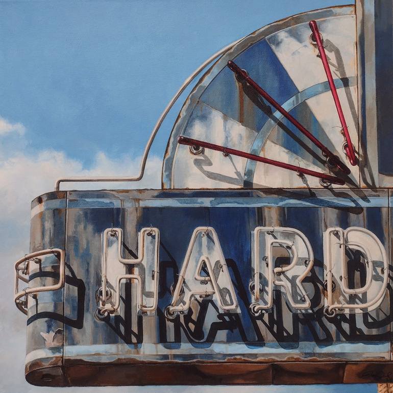 John Sharp is a photorealist artist and art educator who resides with his family in Tennessee. "The urban landscape is my greatest passion. Sadly, it is drastically changing and the signage industry of yesteryear is ever-fading. To capture these marvels is a privilege to me. Whether it is an old neon sign, an abandoned space, or forgotten object, I am captivated by how years or decades of rust and decay slowly creep through the surface. To me, there is something beautiful in the abandoned and I feel somehow it is my purpose as an artist to capture them before someone else takes note, and they are gone forever." John Sharp has had his work exhibited in galleries such as the Uptown Arts Center in Chicago, Illinois, the Mondak Heritage Center in Sydney, Montana, Art House Co-op in Brooklyn, New York, and the Siena Art Institute in Siena, Italy. Sharp was also a featured artist in Hyperrealism Magazine #11 in 2020. In 2012 his painting "One Left" was selected for a featured collection by Rebecca Wilson, chief curator at Saatchi Art.