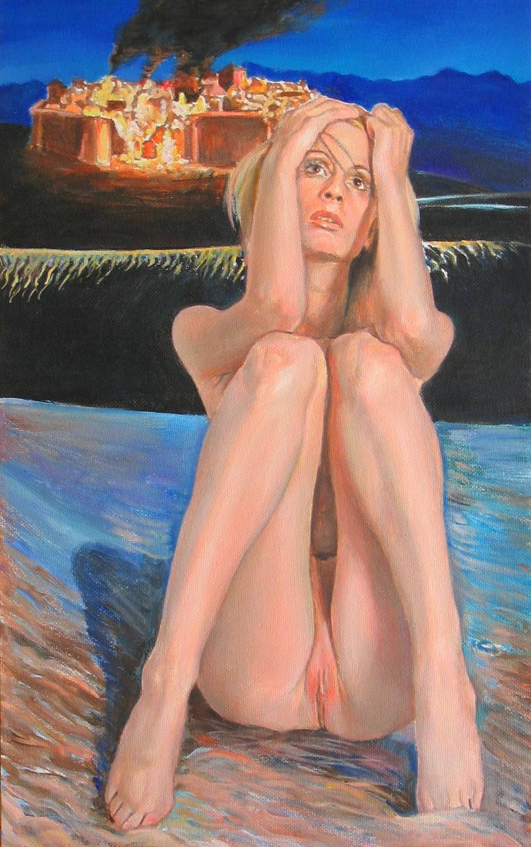 The painting captures Cassandra’s tragic fate intertwined with Troy’s downfall. In Greek mythology, Cassandra was blessed with the gift of prophecy by Apollo but was cursed never to be believed after she spurned his advances. Here, she embodies ignored wisdom and impending doom. The burning Troy sy...