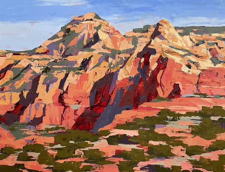 I painted this piece late in October, perched above Sedona, AZ. I awoke just before sunrise and made my way to a hiking trail from which I overlooked this scene. The drama of the casting shadows lured my eye and drew me to capture them in paint. The light moved fast and before I could finish the pie...