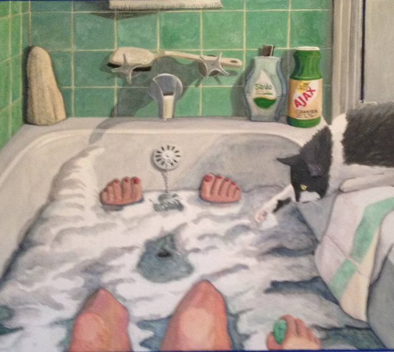 My cat Martha used to like to come into the bathroom when I was taking a bath. Sometimes she would stretch over the rim of the tub and bat suds. It was a form of play for her.