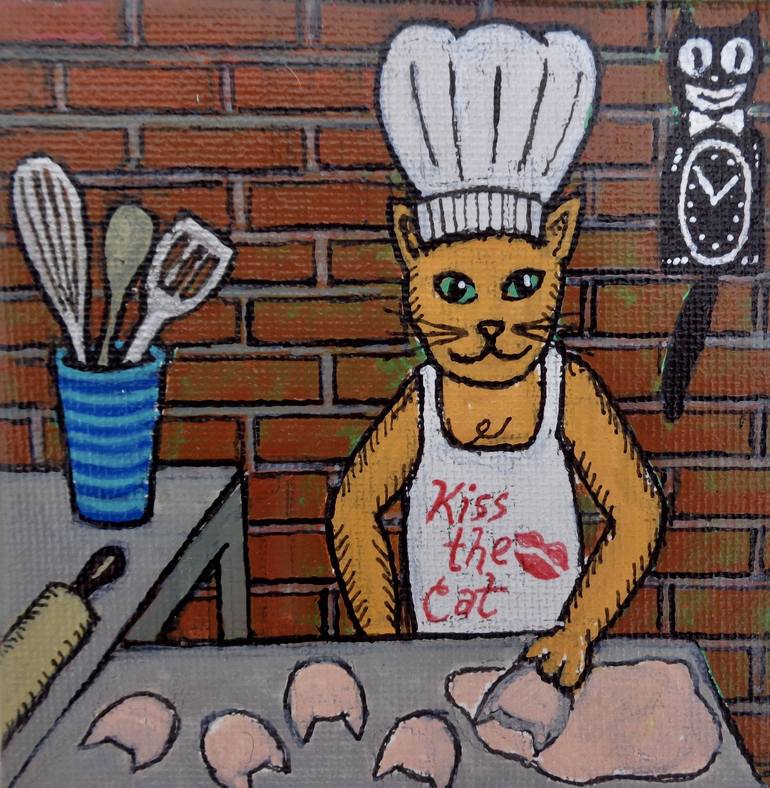 This cat painting is one of a series in which I take the name/place of "Catskills" and transform it into the visual pun "Cat with Skills". In this painting the cat's skill is baking.