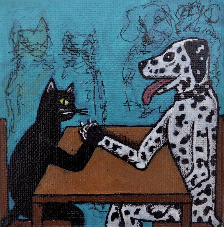 This is one of a series of small cat paintings in which I take the name/place of "Catskills" and turn it into a visual pun called "Cat with Skills". In this case the cat has the "skill" to beat a dog at arm wrestling.