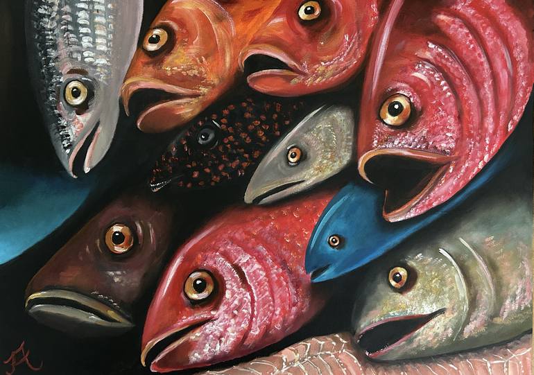 This is a larger version of the fish still life I did earlier this year. I saw some of those fish at Borough Market others are fantasy. I like their diverse skins and colors. The painting is on a stretcher frame ready for hanging.