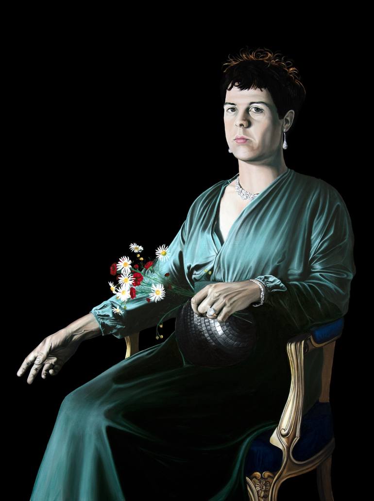 Inspired by court portraits, this painting offers a contemporary reinterpretation of the figure of Catherine II of Russia. The model, dressed in an imperial green gown, embodies an ambiguous authority, somewhere between majesty and modernity. In place of traditional attributes, a black disco ball sy...