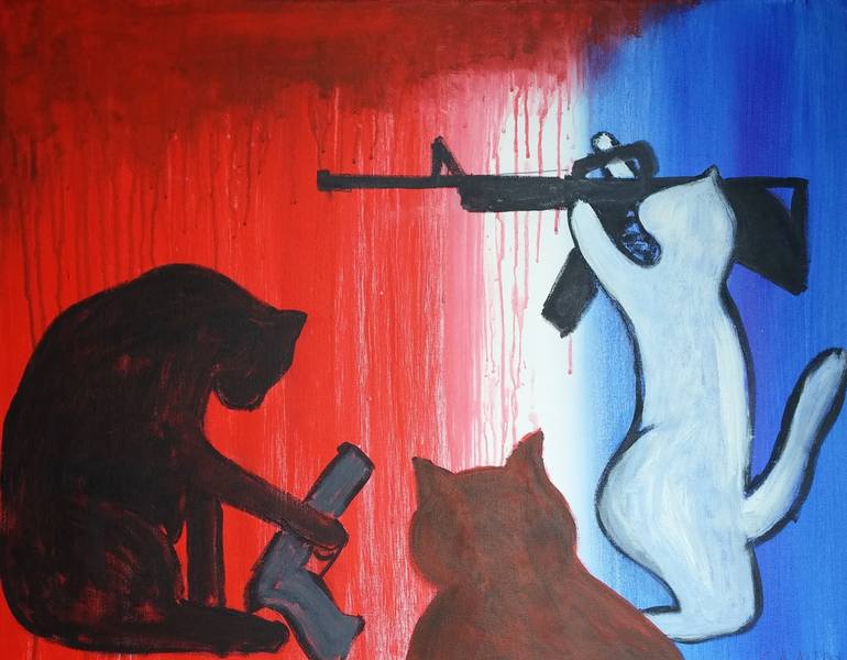 This artwork portrays three cats set against a striking background divided by red on the left and blue on the right, with a white stripe down the middle. The cat on the left is black and is holding a handgun, seemingly contemplative. In the center, a reddish-brown cat sits and faces away, partially ...