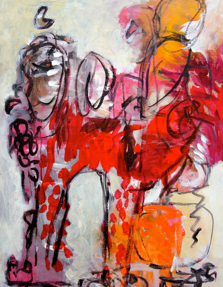 "Celebration 514" is a captivating dance of color and form, inviting you into a world of pure imagination. This painting is a vibrant abstract expression, reminiscent of modern and surrealist styles. Hints of red, white, yellow, and orange intertwine, perhaps suggesting an animal form or the joyous ...