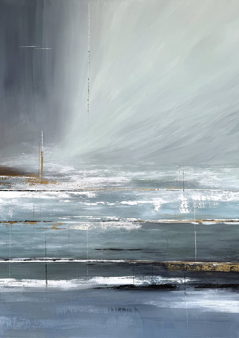 “Celestial Drift” is an original acrylic painting on canvas, size 120 x 85 cm, from the “Symphony of Horizons” series. This abstract composition evokes a serene atmosphere where air and water seem to merge in rhythmic harmony. Layers of soft blues, gentle greys, and subtle golden accents create a fl...